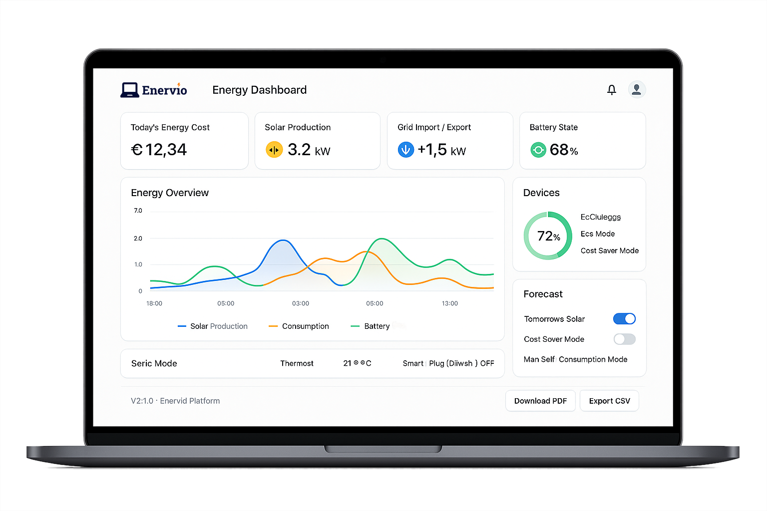 Enervio is a next-generation energy intelligence platform that unifies control, optimization, and insights across residential, commercial, and community energy systems. Designed with AI-driven forecasting and seamless IoT integration, it empowers users to reduce energy costs, boost self-consumption, and manage devices in real time.